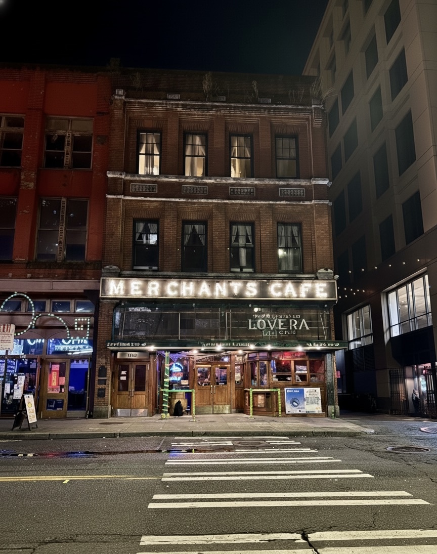 If you love places that look and smell like a hundred years of stories, Merchantâs Cafe & Saloon in Pioneer Square is must-see Seattle nostalgia. Tucked at 109 Yesler Way in the heart of downtown/Pioneer Square, it bills itself as Seattleâs oldest standing restaurant â and walking under that battered marquee feels like stepping into a sepia photograph.